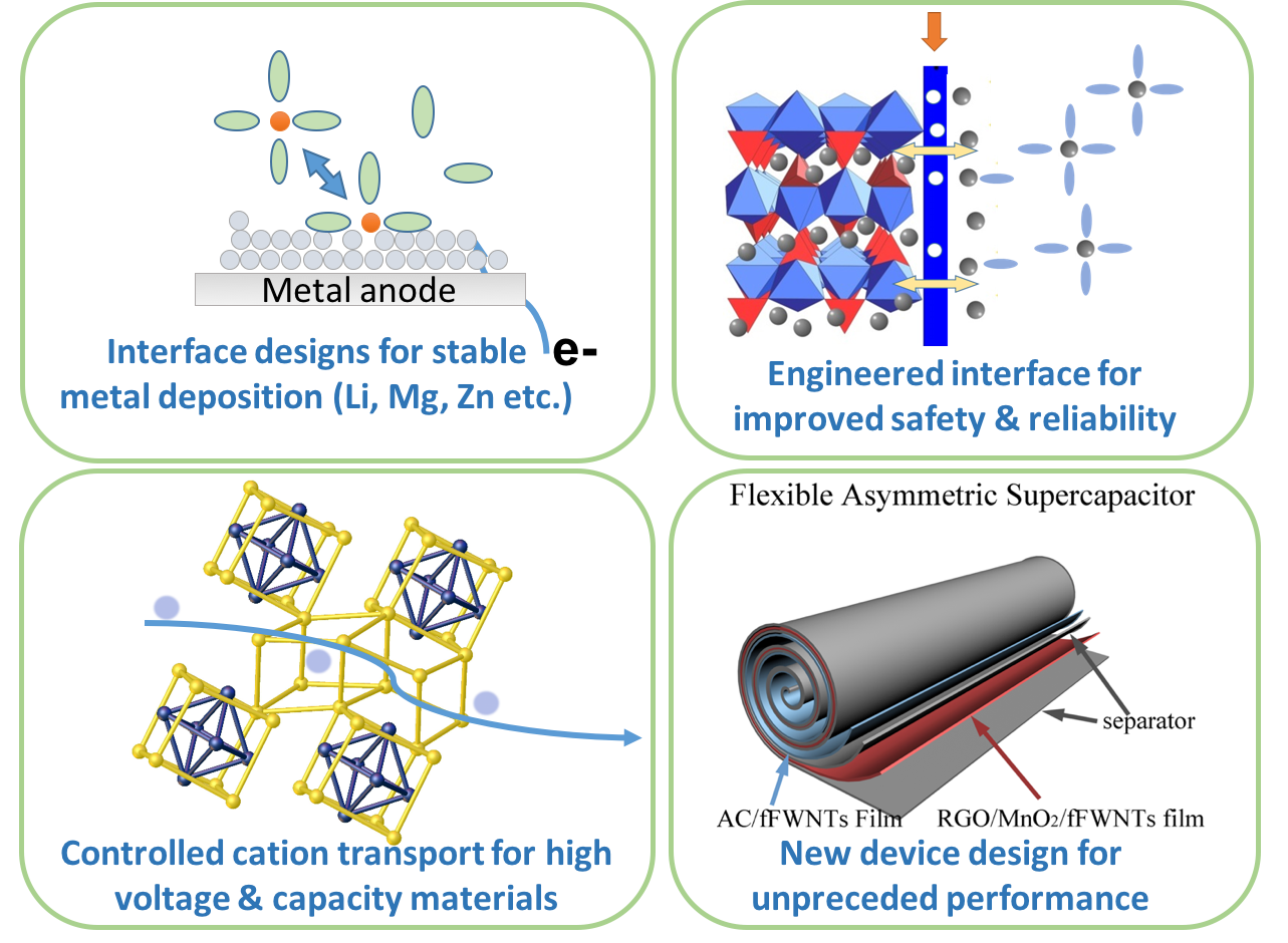 We aim to develop novel energy materials that are meaningful for the next generation electrical energy storage and conversion. We perform fundamental research on understanding how the interplays between surface chemistry and electrochemical potential direct the formation, transformation and stabilization of energy materials, and developing innovative approaches to synthesize materials with structure and property controlled across multiple length scale.We study the applications of these novel materials by assembling and testing various electrochemical devices particularly batteries and fuel cells. Some applications that we are currently interested in are high energy density rechargeable batteries and electrocatalysts that convert electricity into energy-dense liquid fuels.